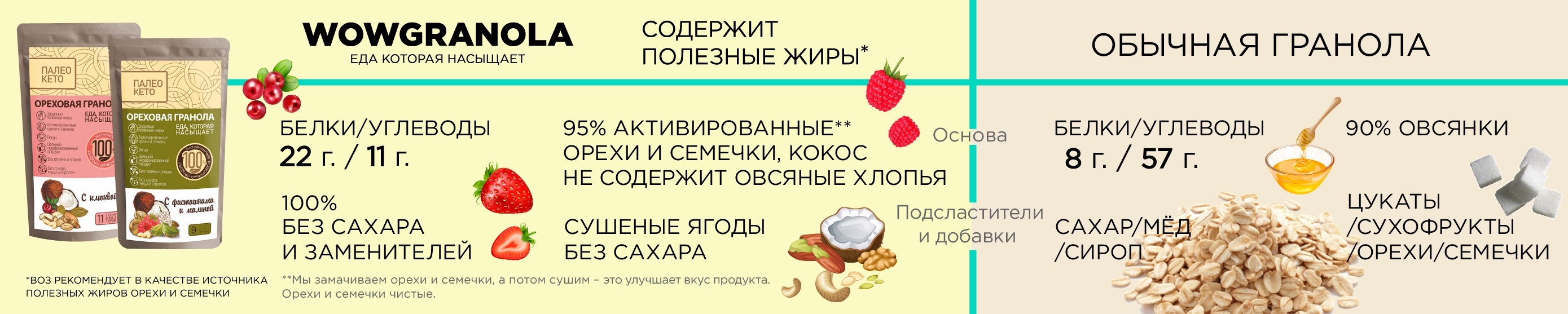 В составе нашей гранолы лишь активированные орехи, семена, бурбонская ваниль и сушеные ягоды. Купить гранолу, которая соответствует принципам здорового питания Вы можете прямо на нашем сайте. Благодаря богатому составу палео гранола обладает большим количеством здоровых жиров, растительного белка, который быстро усваивается организмом человека и умеренным количеством сложных углеводов.